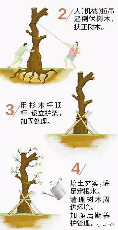 一、排積水:因臺風的作用使得古樹伏倒并受淹的古樹應及時進行排水,確保根系正常呼吸。